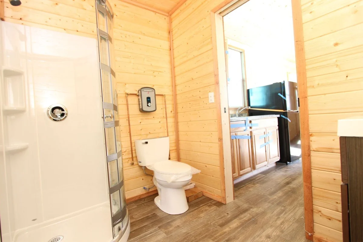 Full Bathroom with 36″ one piece shower, Vanity with Sink, Toilet, Tankless Water Heater, and Stackable Washer / Dryer Connections
